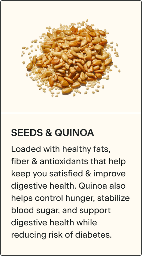 Loaded with healthy fats, fiber and antioxidants that help keep you satisfied and improve digestive health. Quinoa also helps control hunger, stabilize blood sugar, and support digestive health while reducing risk of diabetes.