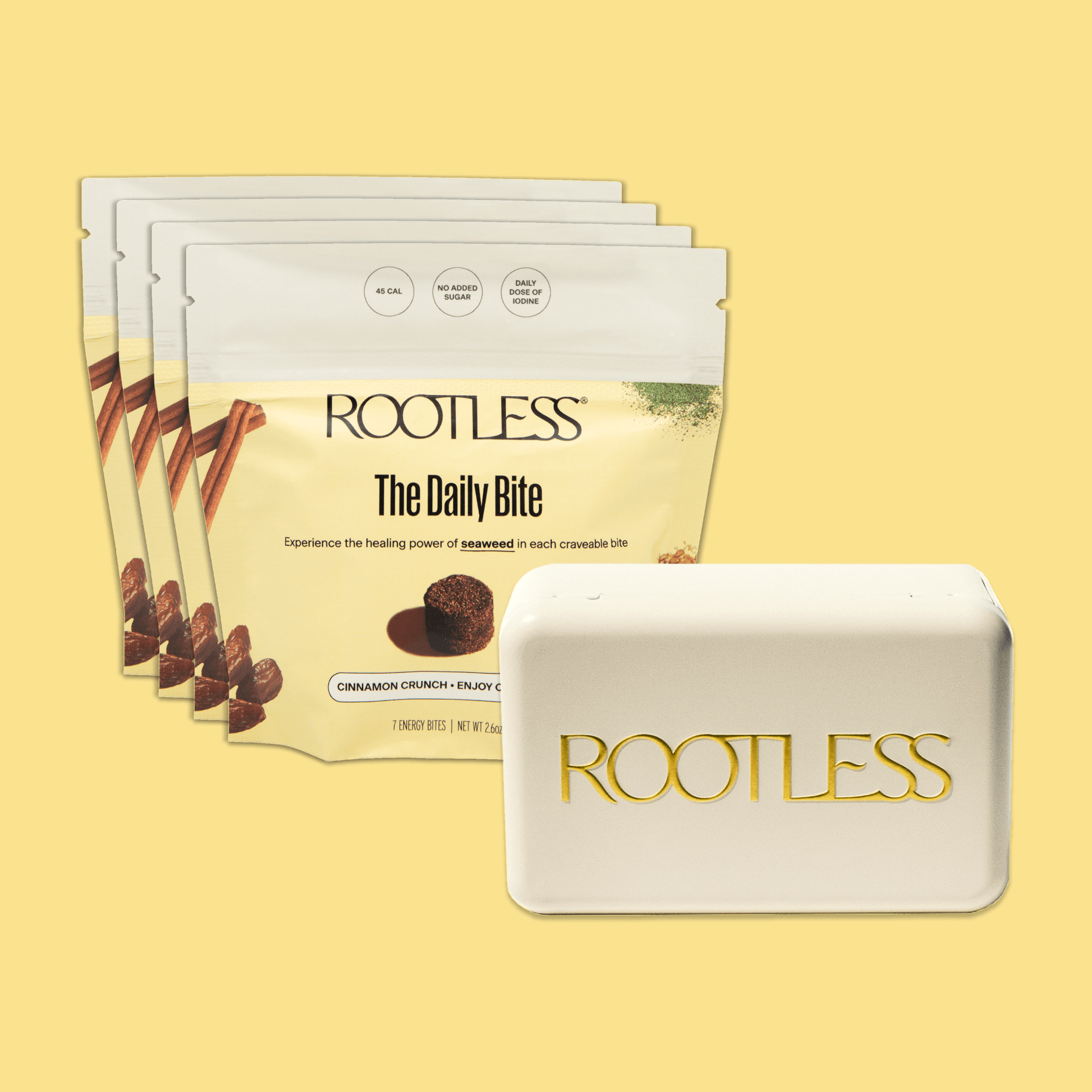 Supercharge your hormone health and reclaim your energy, radiant skin, gut health, and cognitive well-being with The Daily Bites! Crafted with our Rootless™ Proprietary Seaweed Blend—featuring 5 powerful seaweed species—plus whole food ingredients like dates, almonds, seeds, and quinoa, each Daily Bite delivers 100% of your daily iodine, and 40+ essential macro and micronutrients. Eat one bite a day!