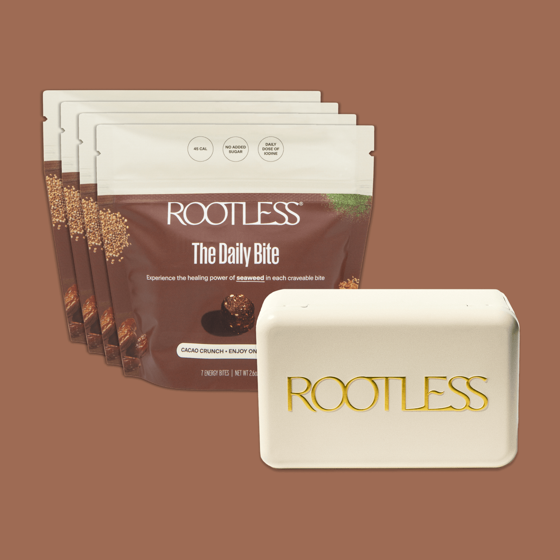 Supercharge your hormone health and reclaim your energy, radiant skin, gut health, and cognitive well-being with The Daily Bites! Crafted with our Rootless™ Proprietary Seaweed Blend—featuring 5 powerful seaweed species—plus whole food ingredients like dates, almonds, seeds, and quinoa, each Daily Bite delivers 100% of your daily iodine, and 40+ essential macro and micronutrients. Eat one bite a day!